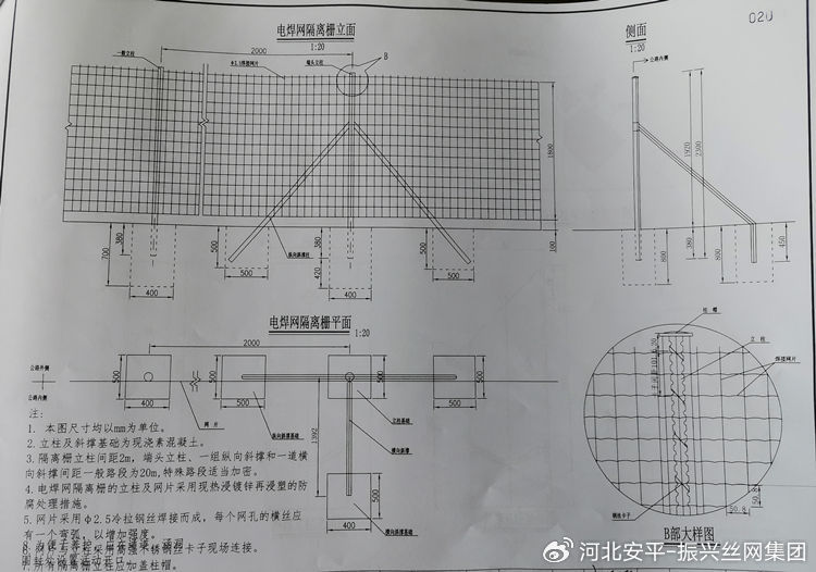 3、电焊网隔离栅立柱间距2m,端头立柱、一组纵向斜撑和一道横向斜撑间距一般路段为20m,特殊路段适当加密。