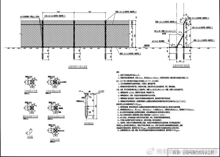 2、金属网围栏类型为镀锌钢丝网,丝径5.0mm ,网孔为80mmx80mm.安装要求应按照《公路交通安全设施设计规范》JTGD81- 2017和《公路交通安全设施施工技术规范》JTG F71-2018执行。