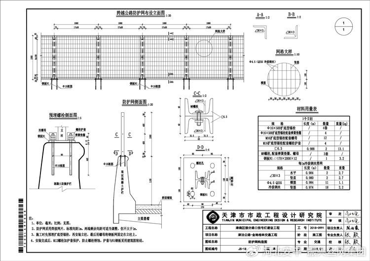 2、跨越公路防护网采用焊接网片,标准间距1米,两端剩余间距可适当调整,但不大于1米。